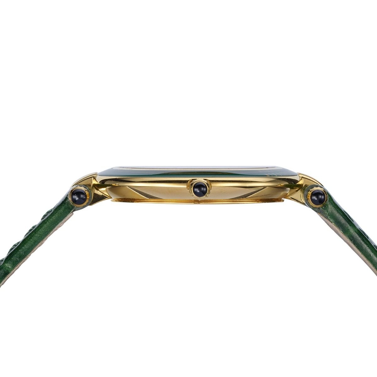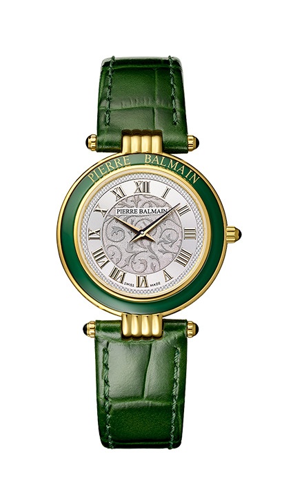 Pierre Balmain Haute Elegance B81339212. Montre dame avec mouvement quartz. Boîtier est en acier inoxydable combiné avec un revêtement de PVD jaune. Montre étanche 5 ATM (50m). Horloge au cadran gris et bracelet cuir vert. Montre, analogique avec verre saphir inrayable.